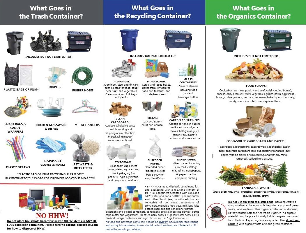 The organics recycling program commenced for residents on February 1, 2021 and then on January 1, 2022 for commercial customers. Escondido residents are able to place food scraps (in addition to yard waste) in their green roll-out carts. EDI collects and processes the materials into digestate (which can be further processed into fertilizer) and renewable energy. By reducing the amount of waste sent to the landfill, the program will result in cleaner air, healthier soils, and reduced greenhouse gas emissions.